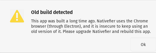 Nativefier apps rely on Electron (a Chromium-based framework). When Electron becomes outdated, the app triggers this warning to remind you to rebuild with a newer, more secure version.