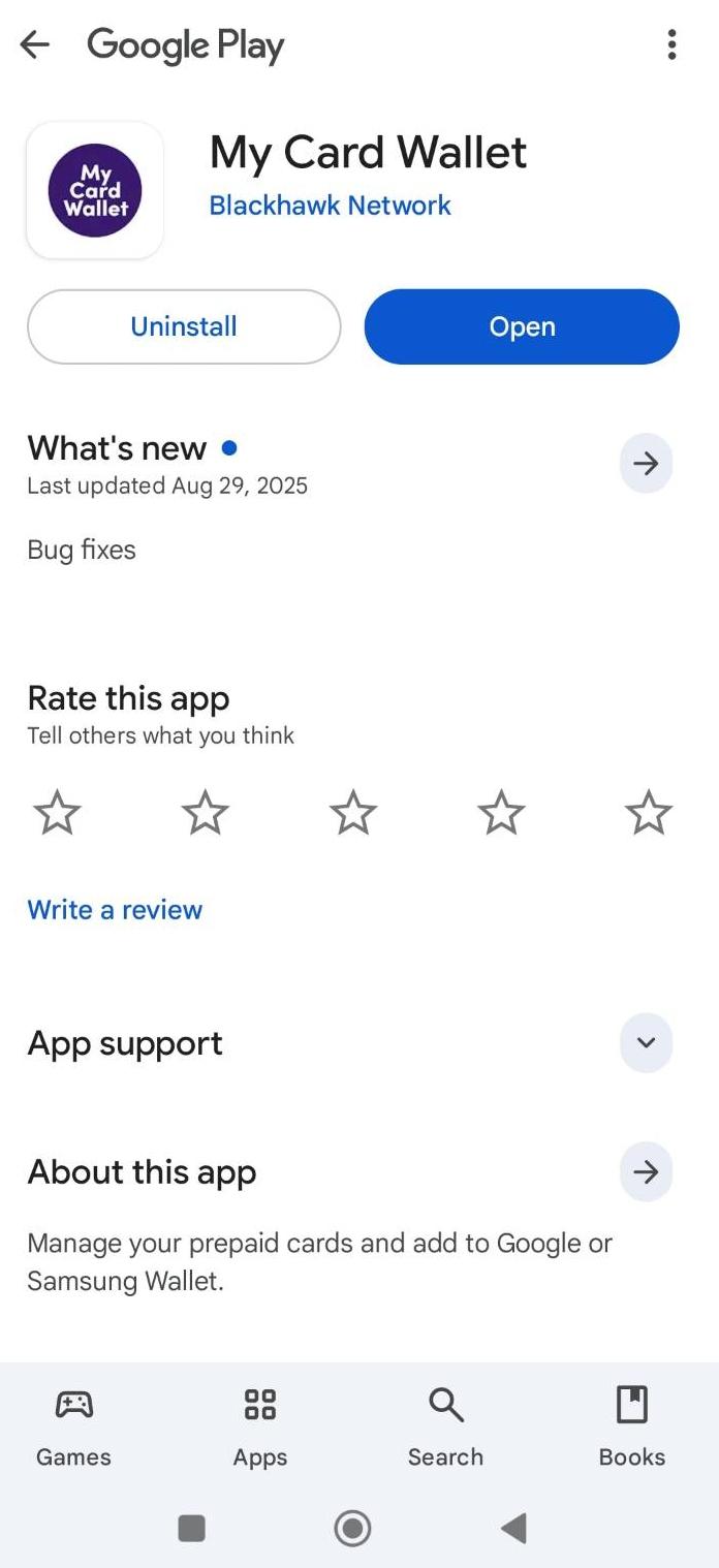 - Download the MyCardWallet app by Blackhawk Network (available on App Store/Google Play).
